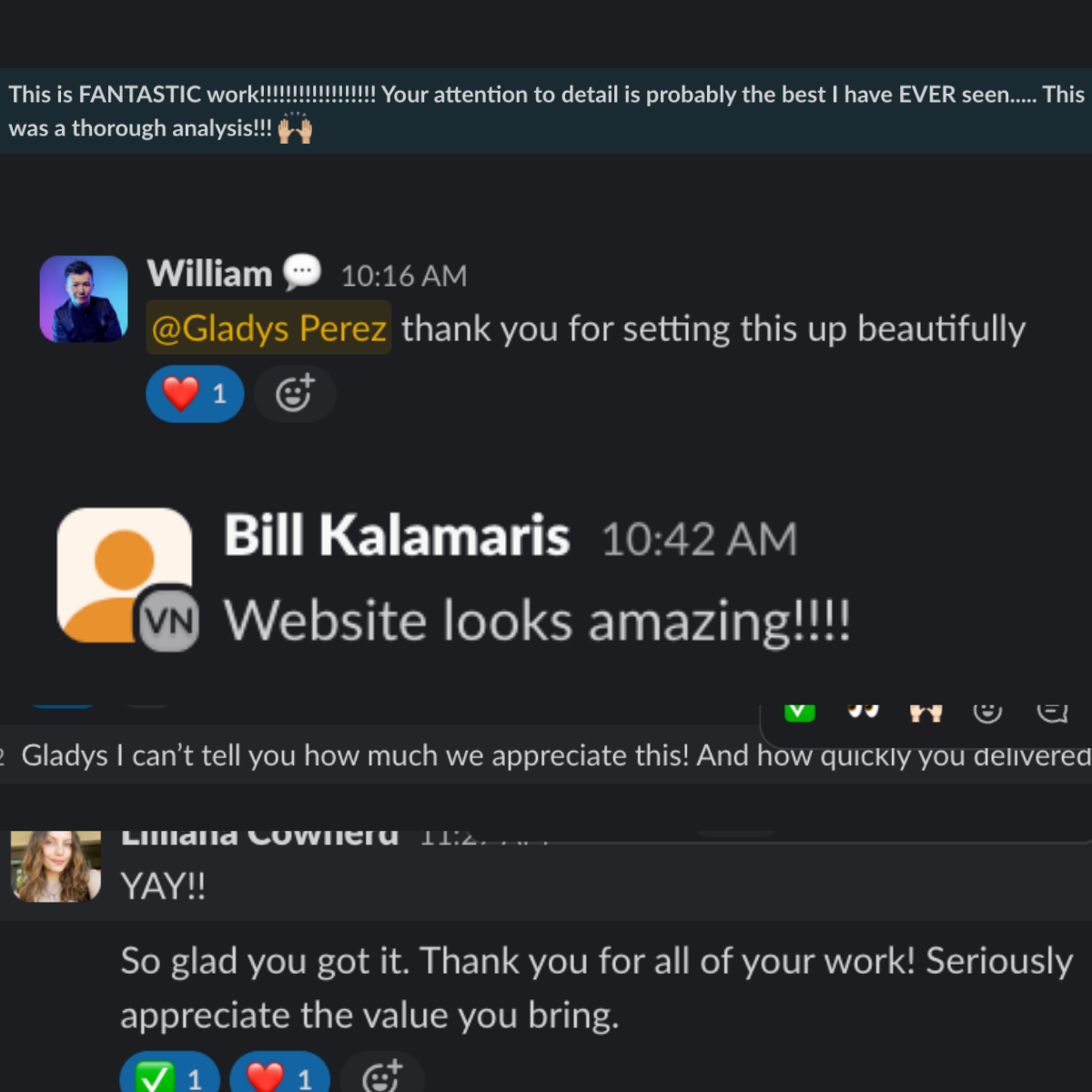 "This is FANTASTIC work!!!!!!!!!!!!! Your attention to detail is probably the best I have EVER seen..... This was a thorough analysis!!!. Thank you so, so so much because, well, since you've joined the team, it's just been so much smoother and smoother on the marketing side, smooth on the tech side, just smoother in general."